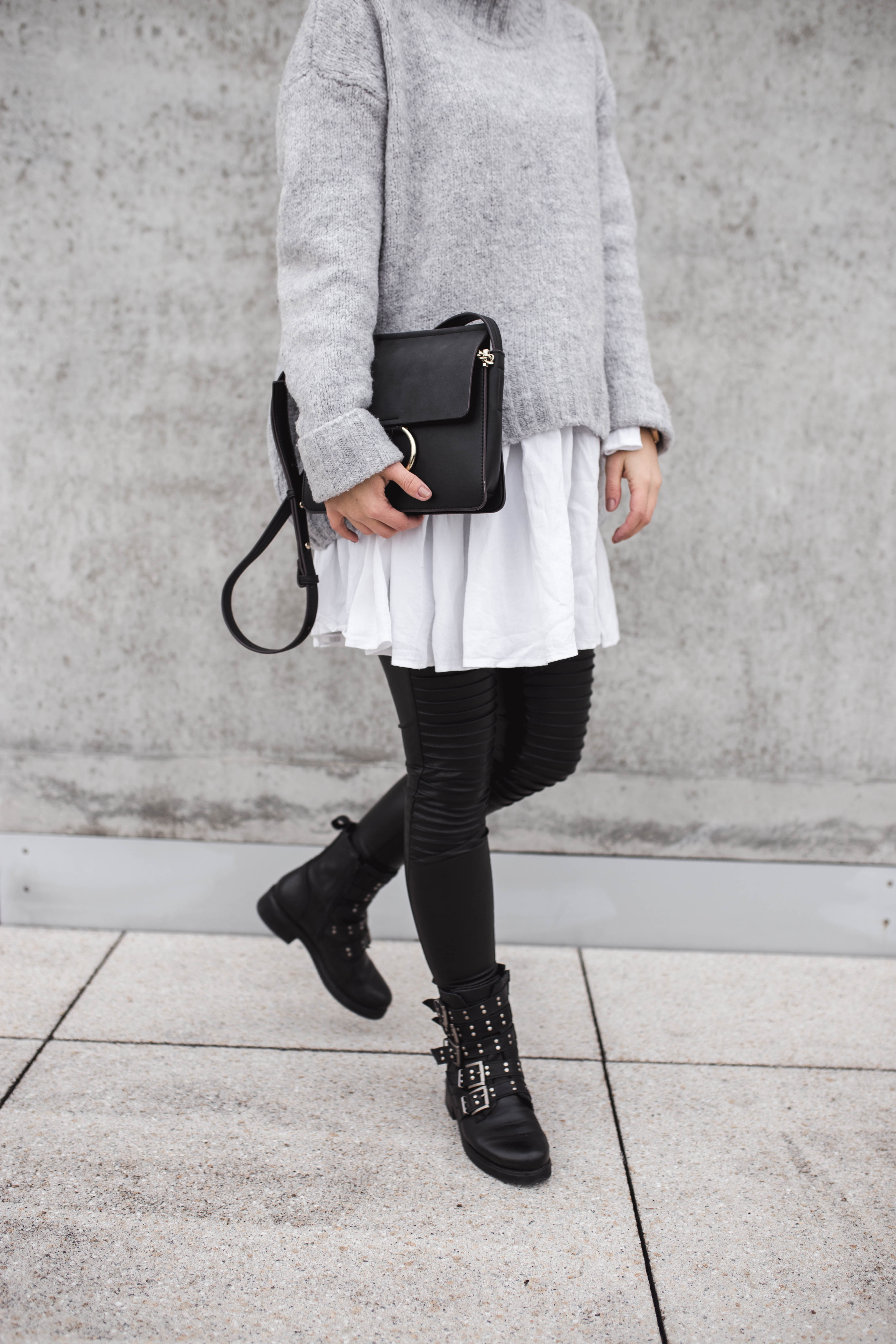 Heute aber konzentrieren wir uns ganz auf ein einige Trends, die im Herbst ziemlich angesagt sind. Und zwar handelt es sich dabei um die altbekannte (Lack)Lederhose, die Biker Boots und wie schon erwähnt, den Strickpullover aka Rollkragenpullover. Drei Trends, welche miteinander kombiniert vielleicht schnell ‚too much‘ aussehen können, aber dennoch die Möglichkeit besteht, einen casual coolen Look daraus zu machen. Wie ich die Teile kombiniert habe, seht ihr nun.
