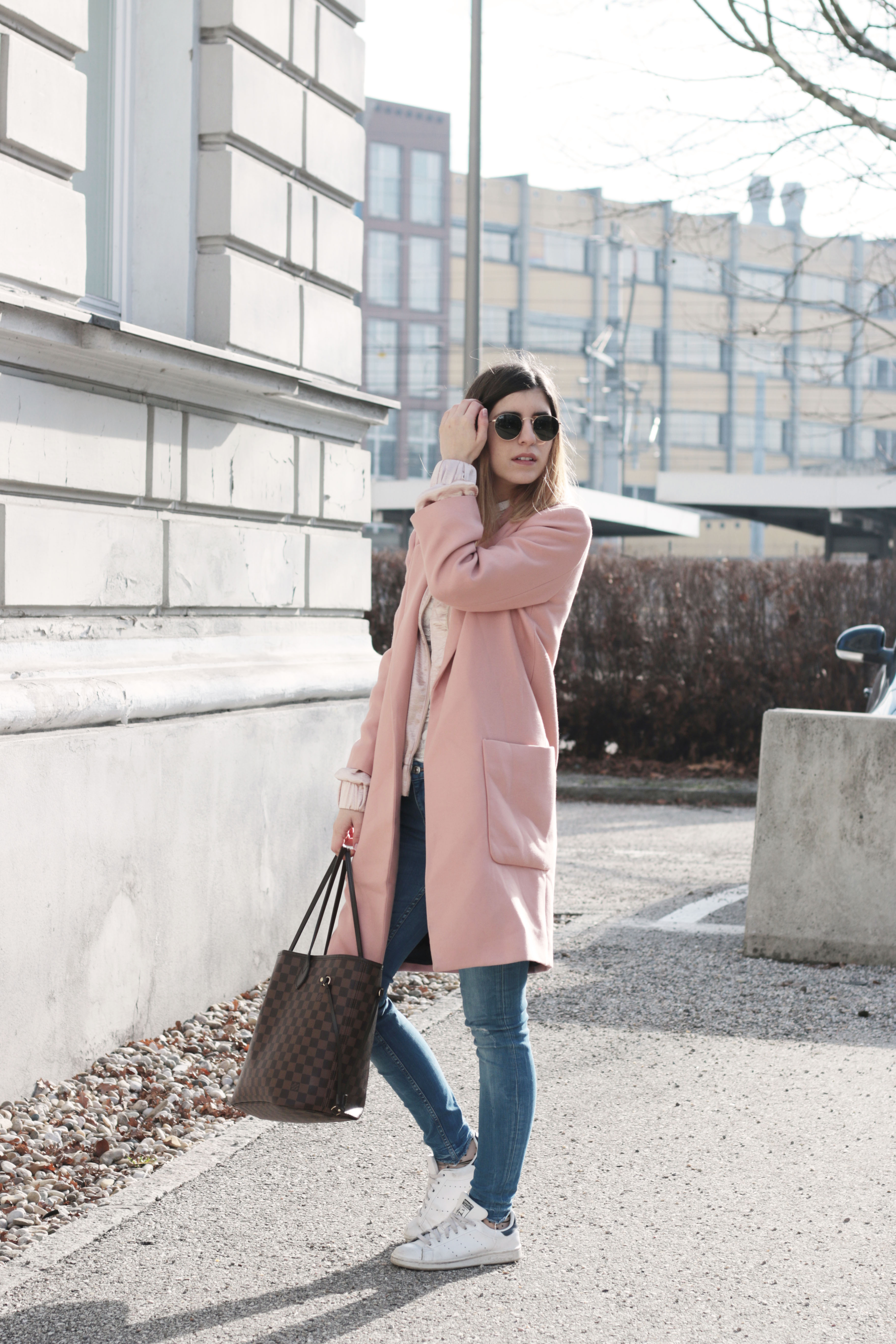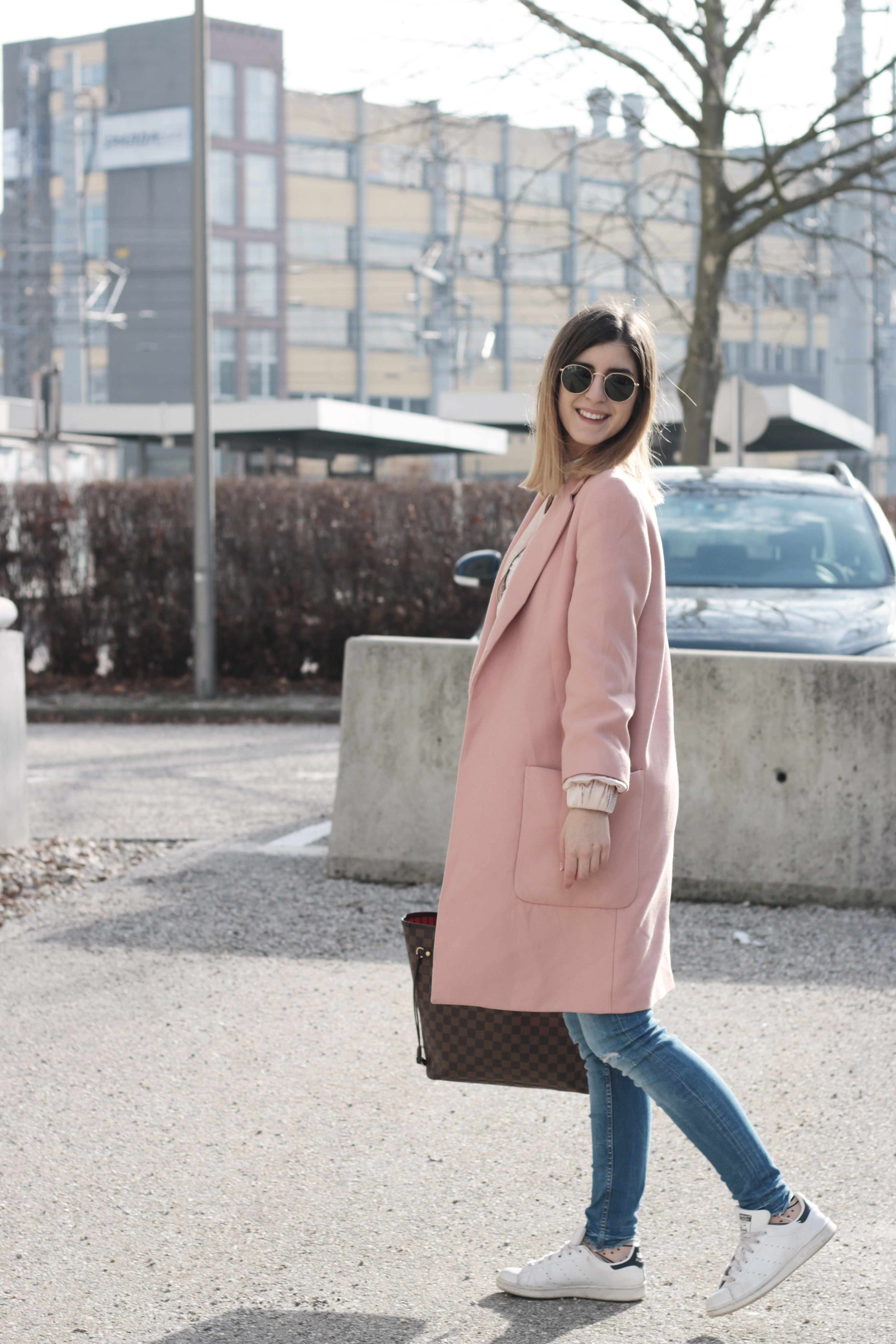 Wenn die Trendfarbe 2017 schon pink ist, warum dann nicht gleich all-over-pink einkleiden? Genau diese Worte kamen mir für diesen Beitrag in den Sinn. Ich entschied mich also zu dem Mantel ein weißes Spitzenshirt, sowie eine rosé-farbene Bomberjacke zu kombinieren. Dazu schnappte ich mir eine ganz einfache Blue-Jeans und meine Adidas Stan Smith (+ darunter Herzal Socken). Abgerundet habe ich den Look mit meiner Louis Vuitton Neverful, welche einfach perfekt für jeden Tag ist.