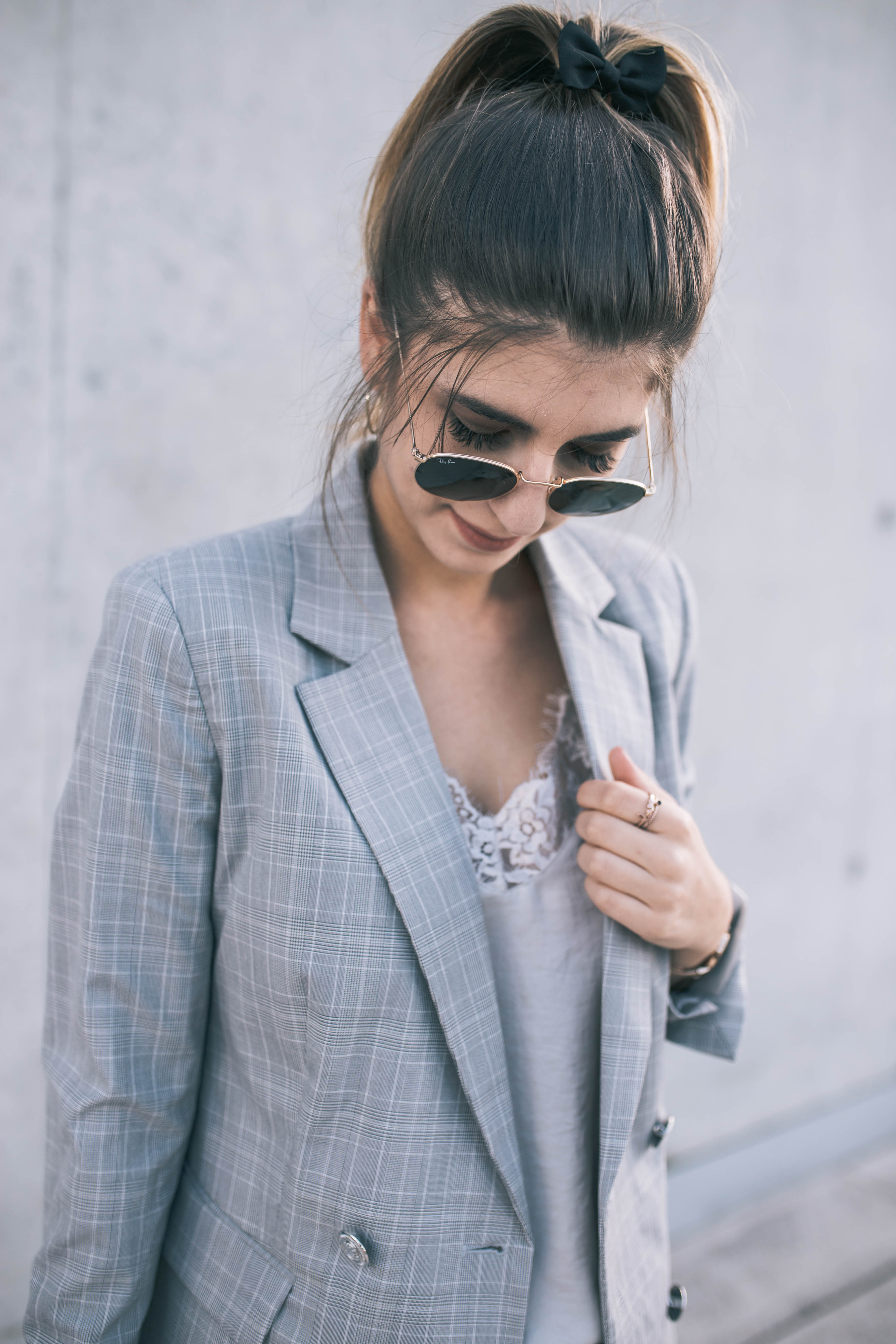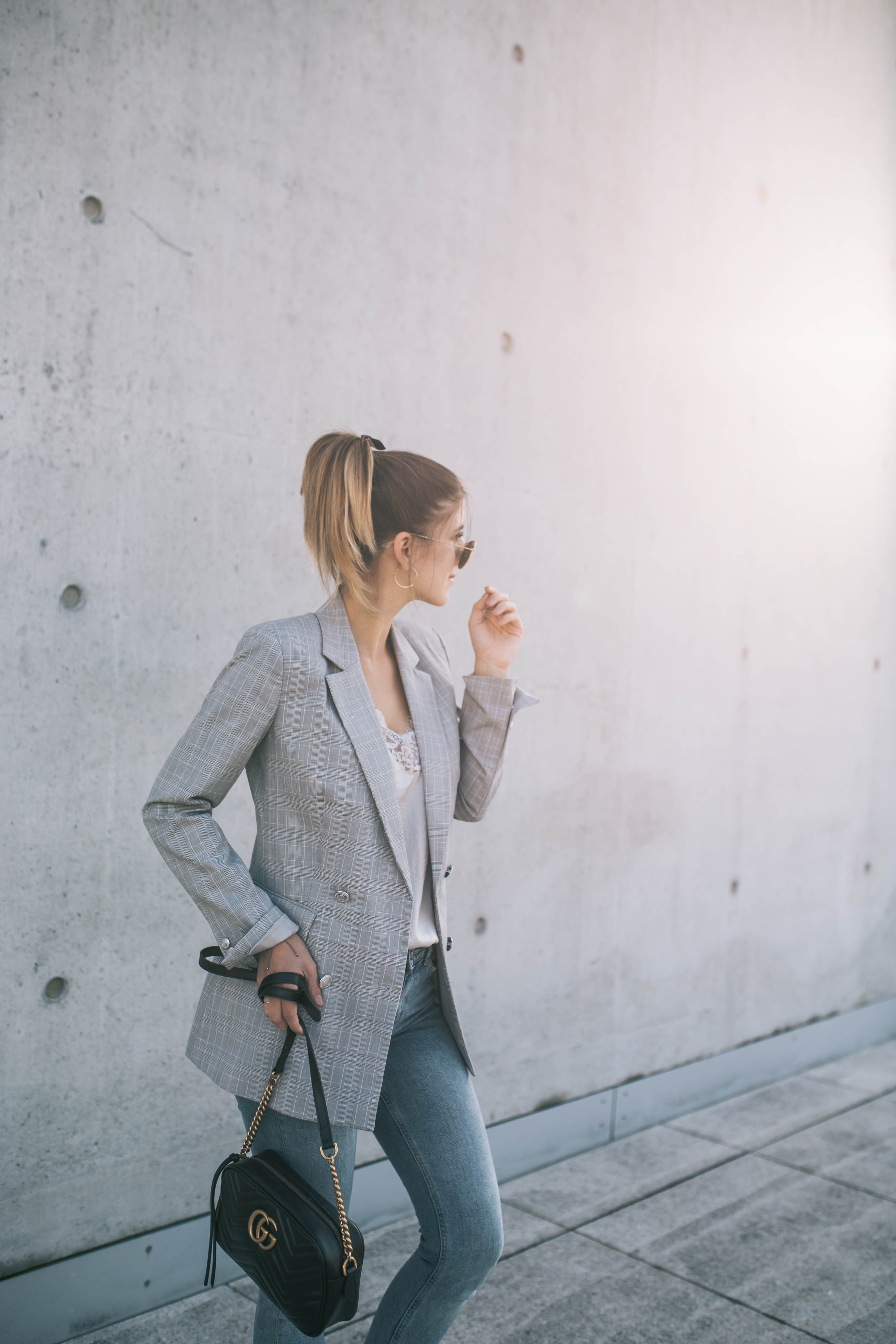 Obwohl ich während Unizeiten selten so, ich sage mal, „edel“ angezogen bin, ist dieser Look ein typisches Uni bzw. Schul Outfit. Die Masche in den Haaren perfektioniert den Look und somit erinnert mich das Outfit ein bisschen an amerikanische High School Uniformen (besonders an die Constance Billard School bei Gossip Girl :P). Doch vor allem am ersten Uni Tag möchte man sich doch hübsch kleiden, weshalb also nicht zu einem absoluten Trend Teil, dem Karo Blazer, greifen? Diese kleine Gucci Tasche ist vermutlich nicht besonders für die Uni geeignet, aber sie hat einfach so unglaublich gut zu dem Outfit gepasst, da musste ich sie einfach tragen. 🙂