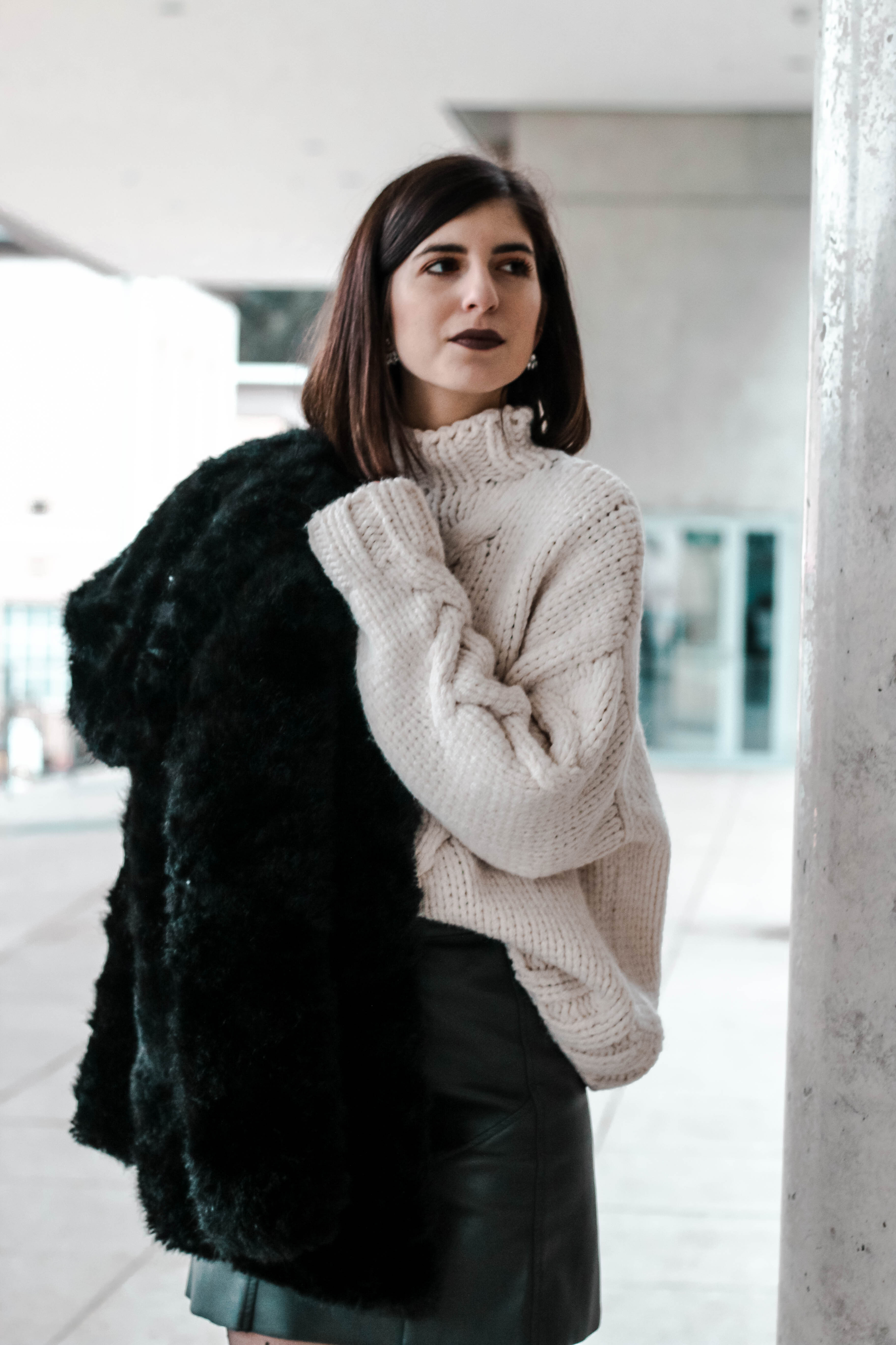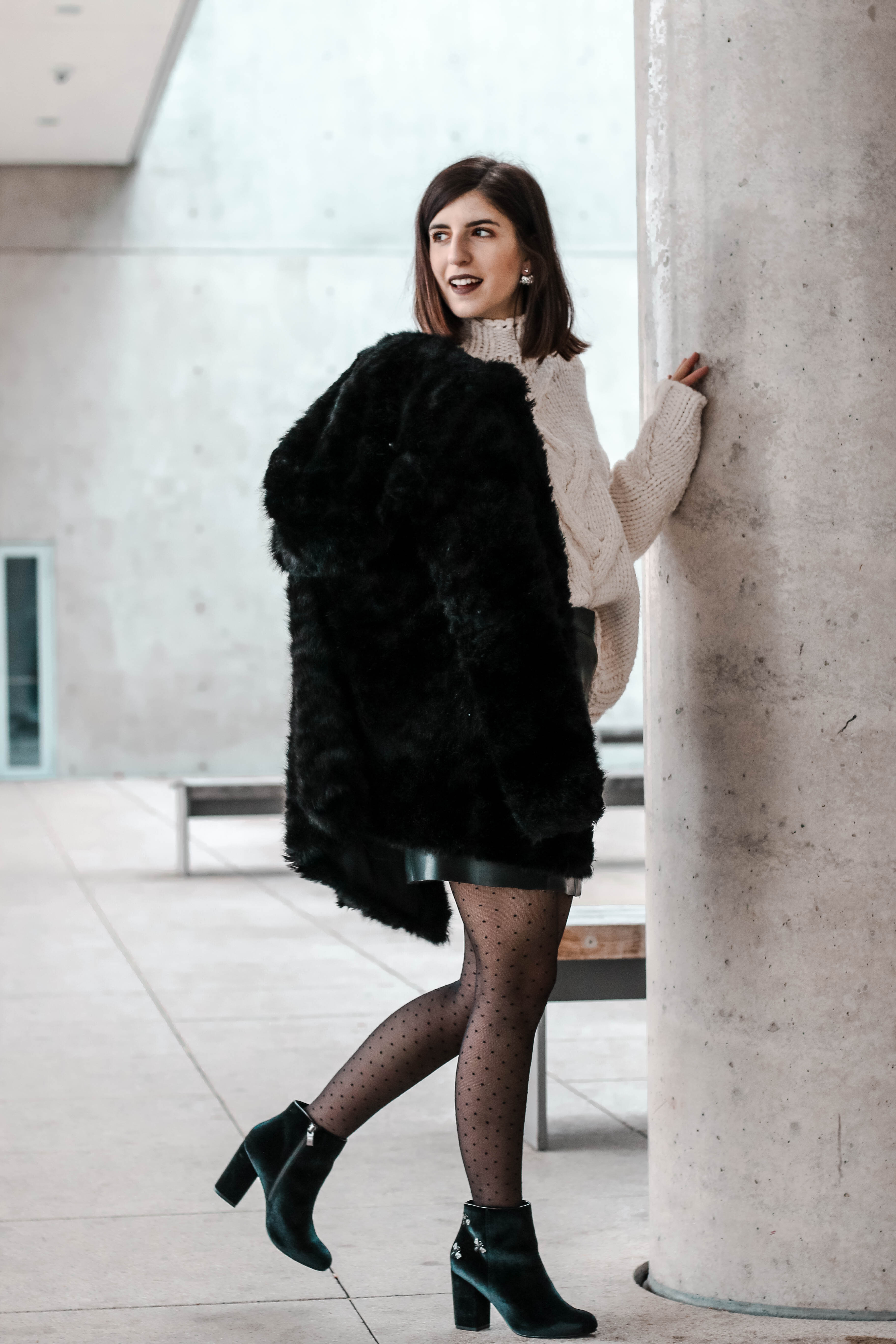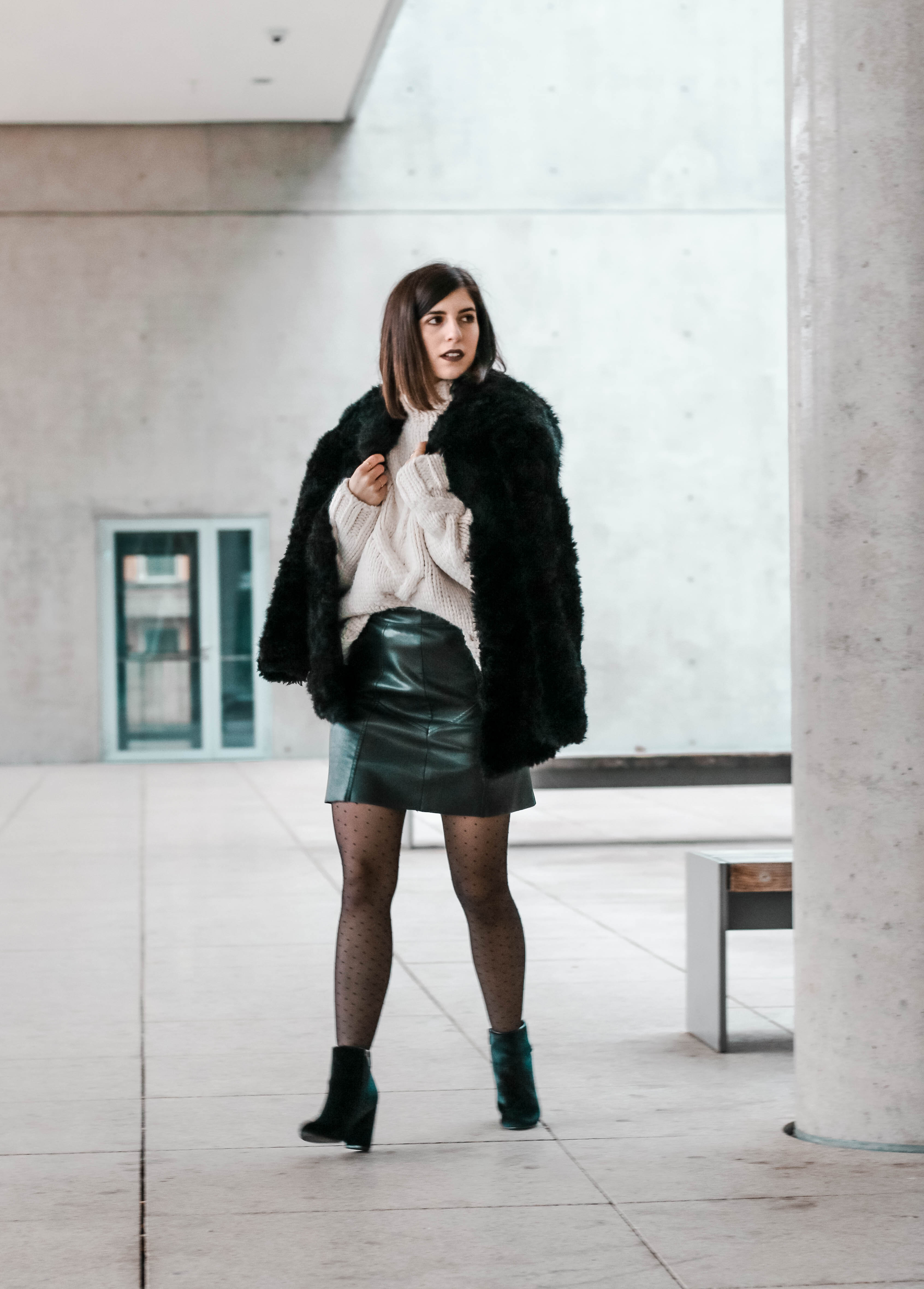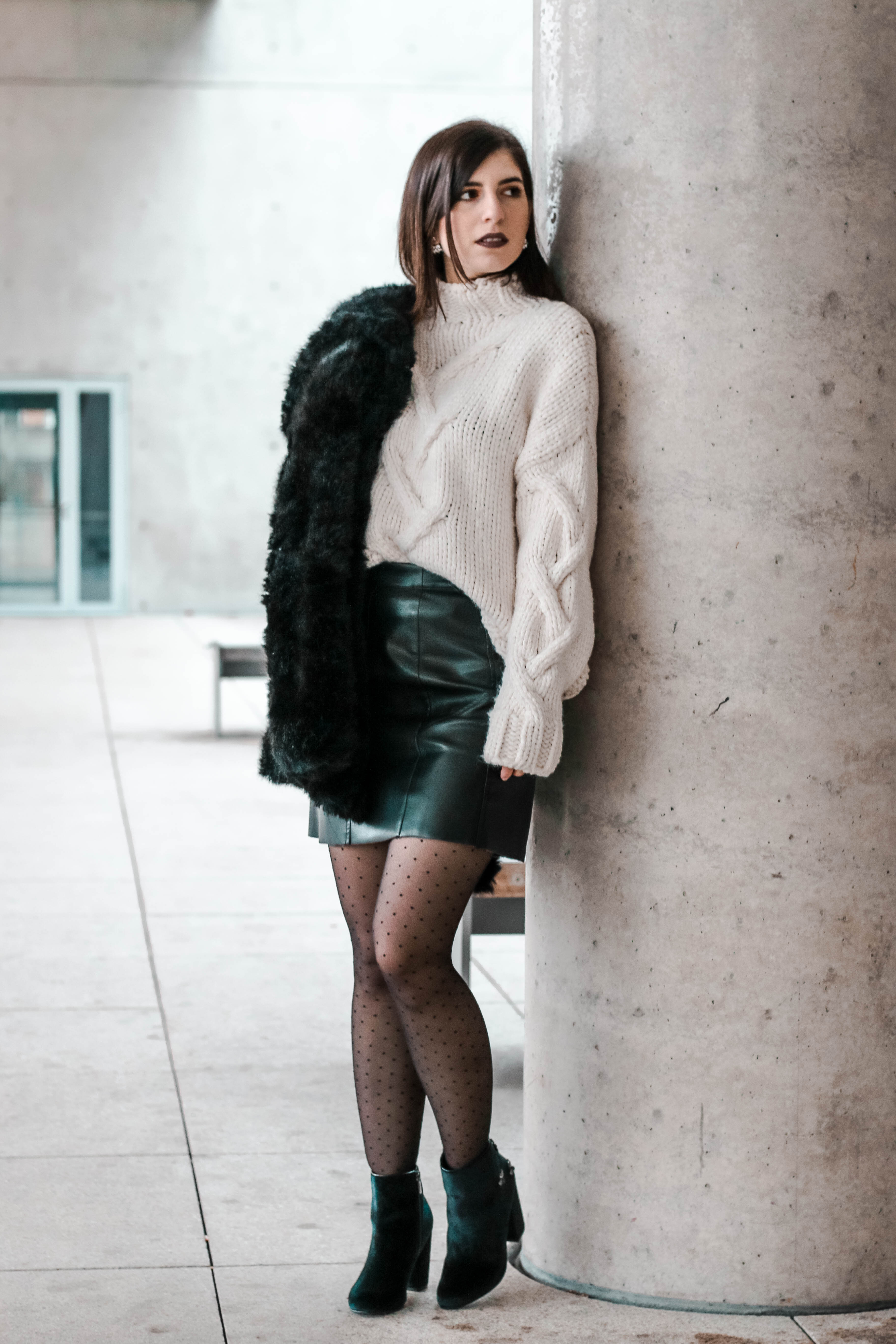 Ein paar Änderungen später, sind wir auch schon beim abendtauglichen Outfit angekommen. Geblieben ist der Lederrock, Pünktchen-Strumpfhose, kuscheliger Pullover und neu dazugekommen sind eine Kunstfelljacke, hohe Samt-Boots, auffällige Ohrringe und ein dunkler Lippenstift. Und so easy verändert mein sein Outfit. Cool, oder?