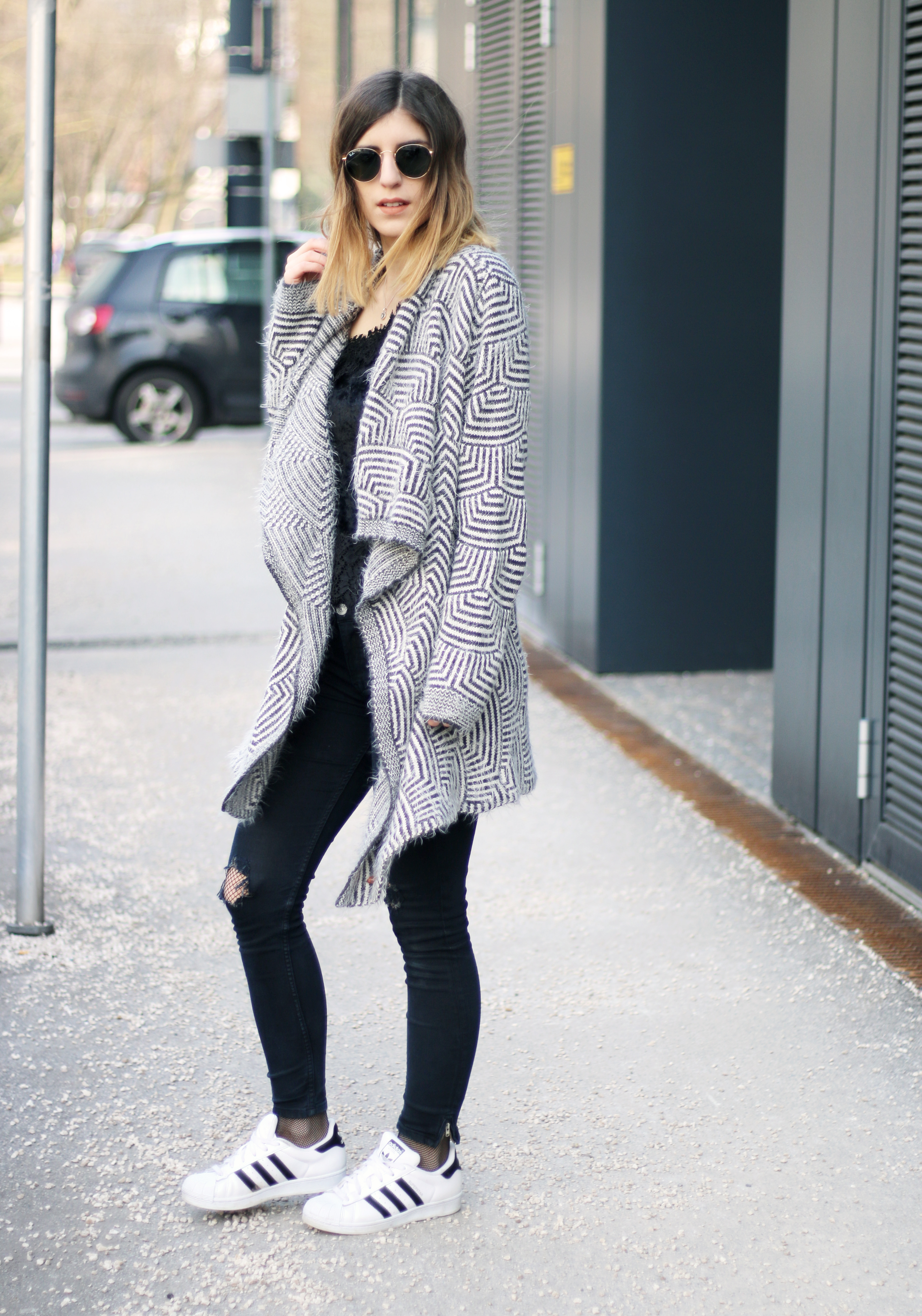 Über das Spitzenshirt kombinierte ich eine kuschelige Weste (danke Mama :b), eine schwarze ripped Jeans und darunter eine Netzstrumpfhose. Abgerundet habe ich den Look mit meinen Adidas Lieblingen und meiner neuen Ray Ban Sonnenbrille.