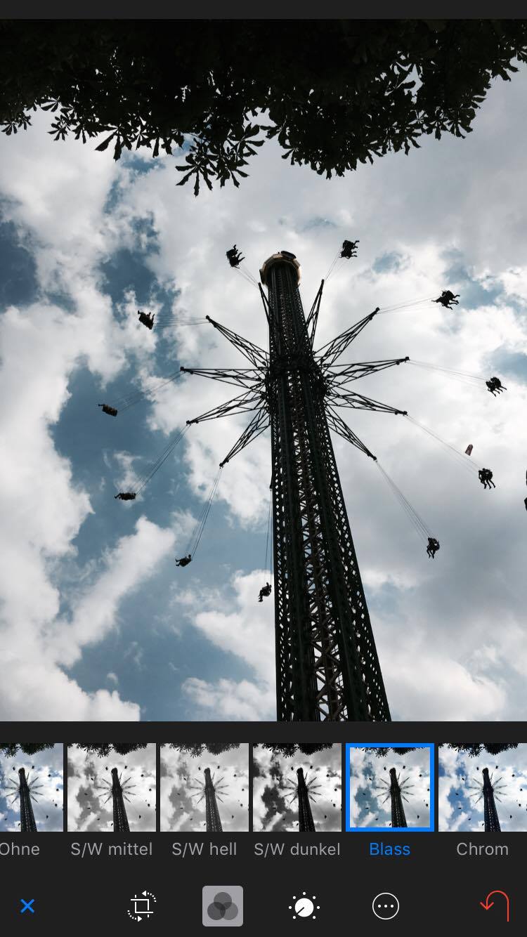 Leider funktioniert meine erste Bearbeitungstechnik nur bei denen, die auch ein iPhone besitzen. Und zwar wissen es viele davon noch nicht, dass man auch direkt bei den Fotos ziemlich viel einstellen kann, wie zum Beispiel die Helligkeit, Kontrast, Schatten,…auch den Farbstich, die Sättigung, und und und. Außerdem gibt es die Möglichkeit unten in der Leiste bei den drei Kreisen so quasi ‚Effekte‘ auf das Bild draufzugeben. Ich verwende sehr gerne ‚Blass‘, da es die Farben etwas abschwächt.