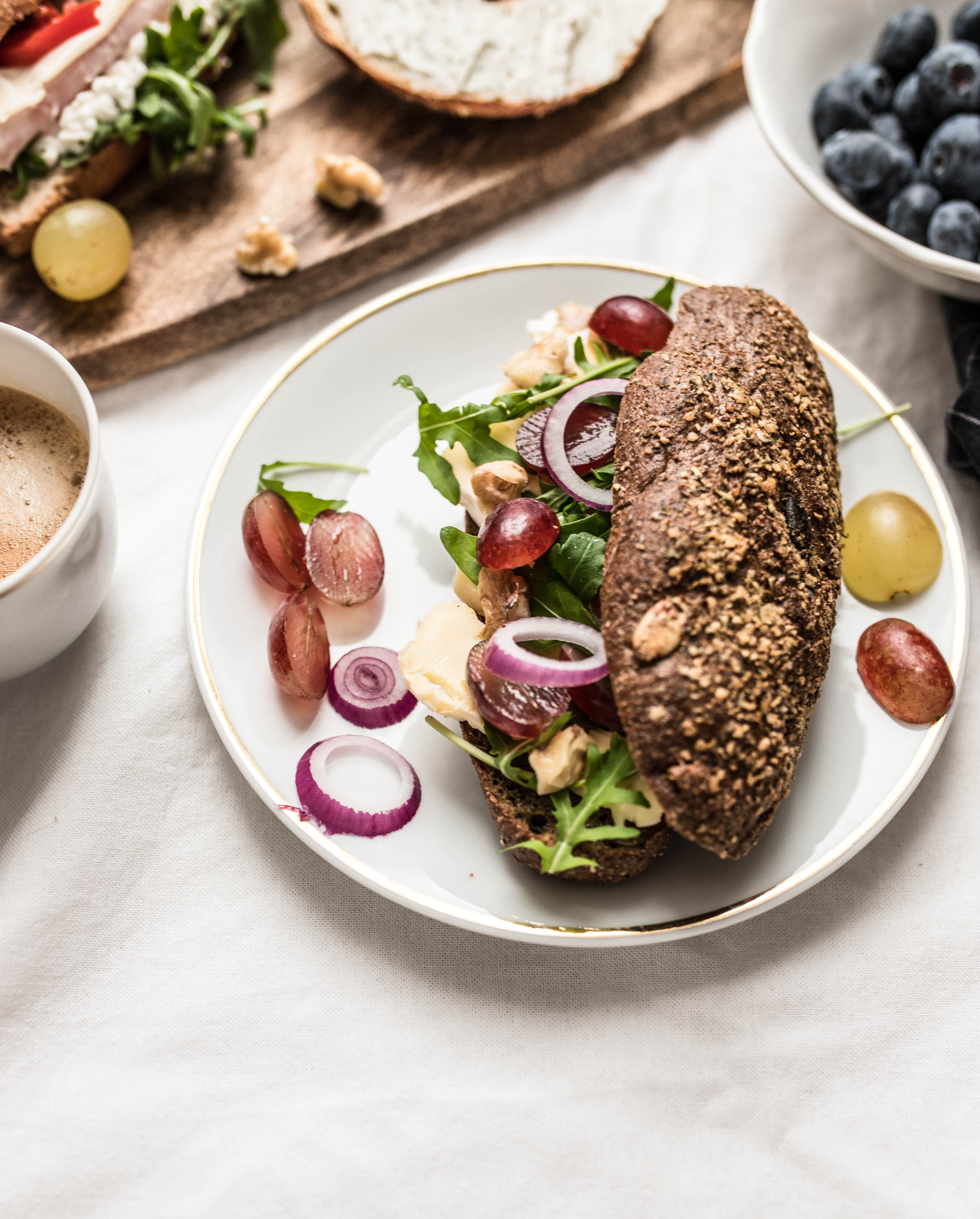 Snack-Idee 3: Low Carb-Weckerl mit Rucola, Camembert und Weintrauben