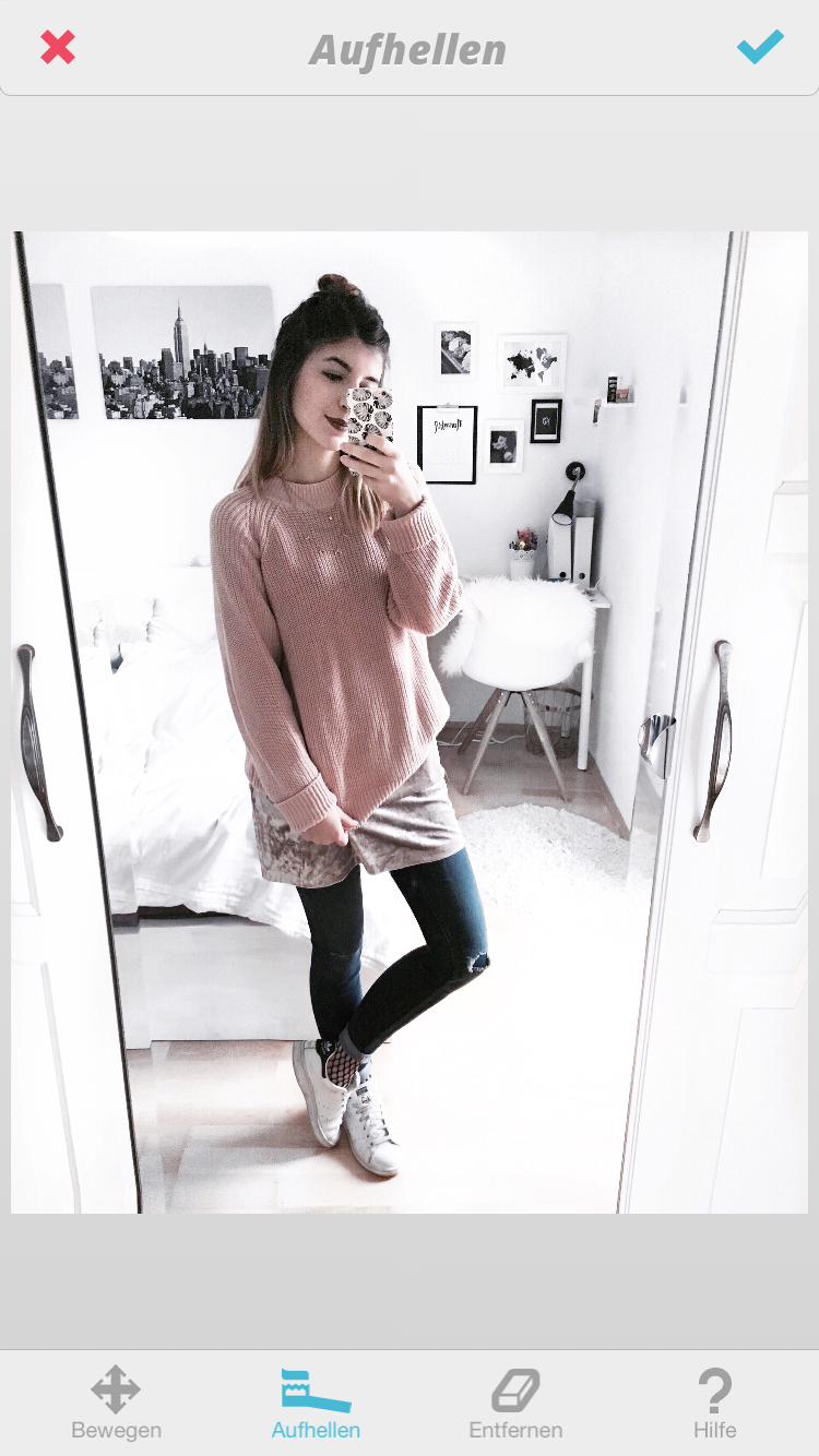 Viele verwenden Facetune, um sich eine geschmeidigere, weichere Haut zu zaubern. Doch das finde ich komplett unsinnig. Natürlich ist es eine ganz coole Funktion, die Facetune anbietet, doch ich möchte euch echte Bilder zeigen. Ich benutze Facetune zum Aufhellen des Hintergrunds beziehungsweise des Bodens bei meinen Bildern. Dabei kommt das Eigentliche besser zum Vorschein und wird nicht abgelenkt vom bunten Hintergrund. Außerdem möchte ich, dass mein Feed auf Instagram einheitlich ist, wobei ein heller Backround sehr gut passt.